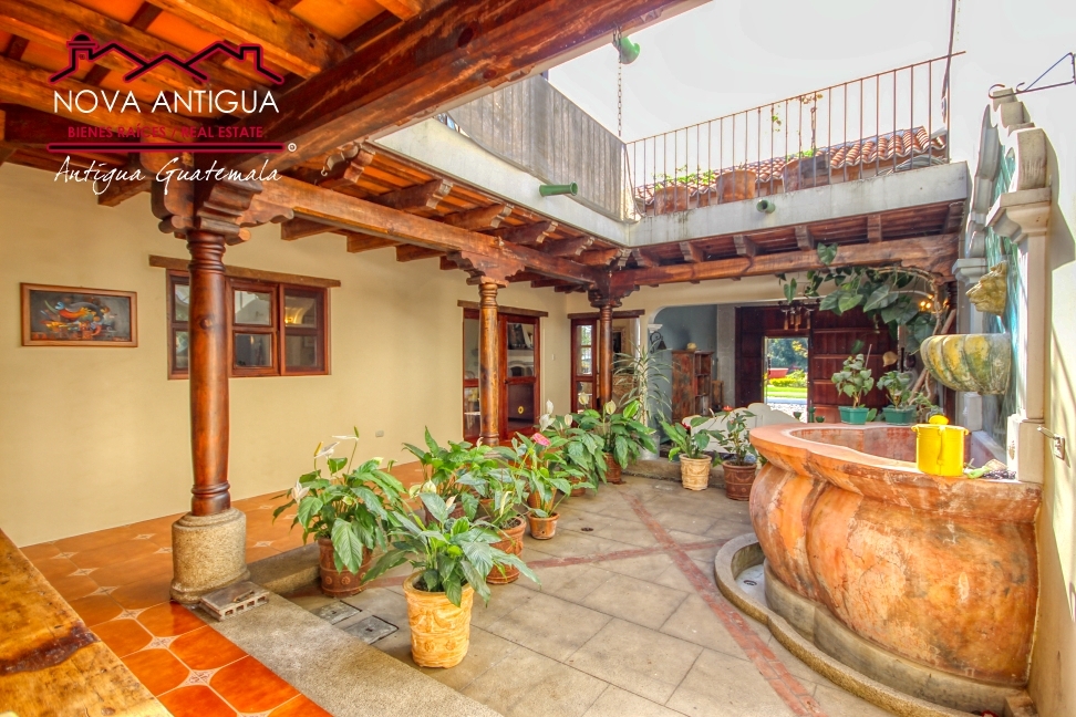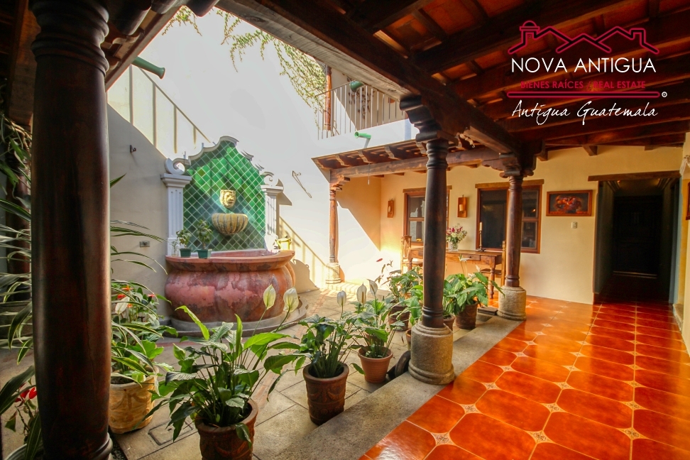 On the first floor, the entrance is through a garage that serves as a foyer, creating a harmonious transition to the interior. At the heart of the home is a charming central courtyard, surrounded by corridors with a Spanish-style terrace and a fountain, which adds character, freshness, and an authentic colonial ambiance.
