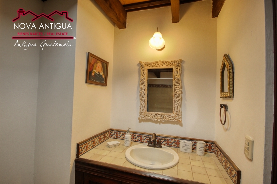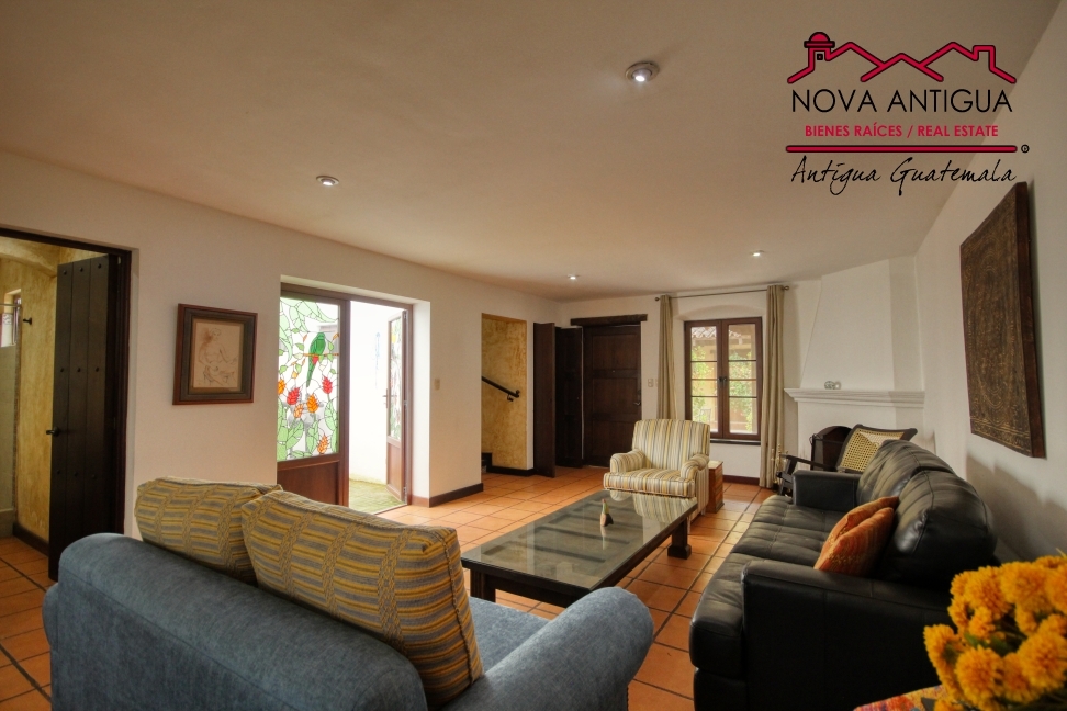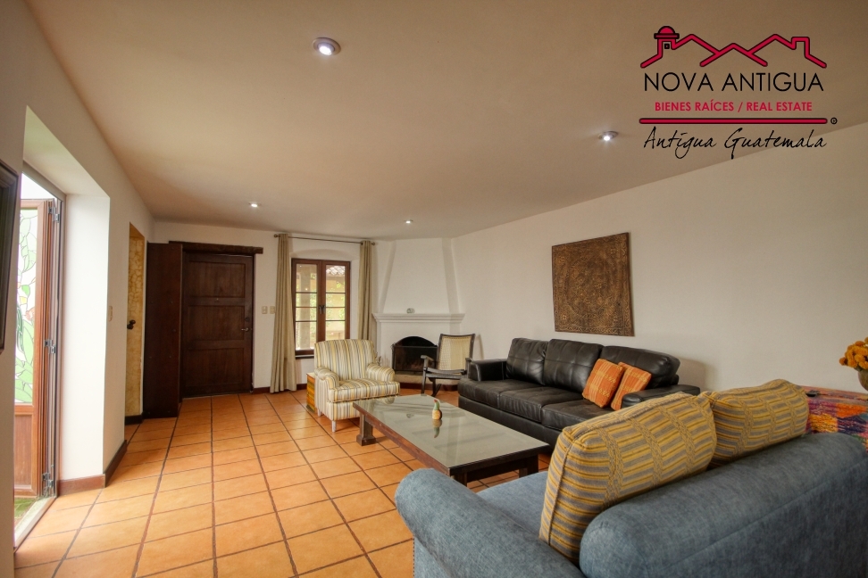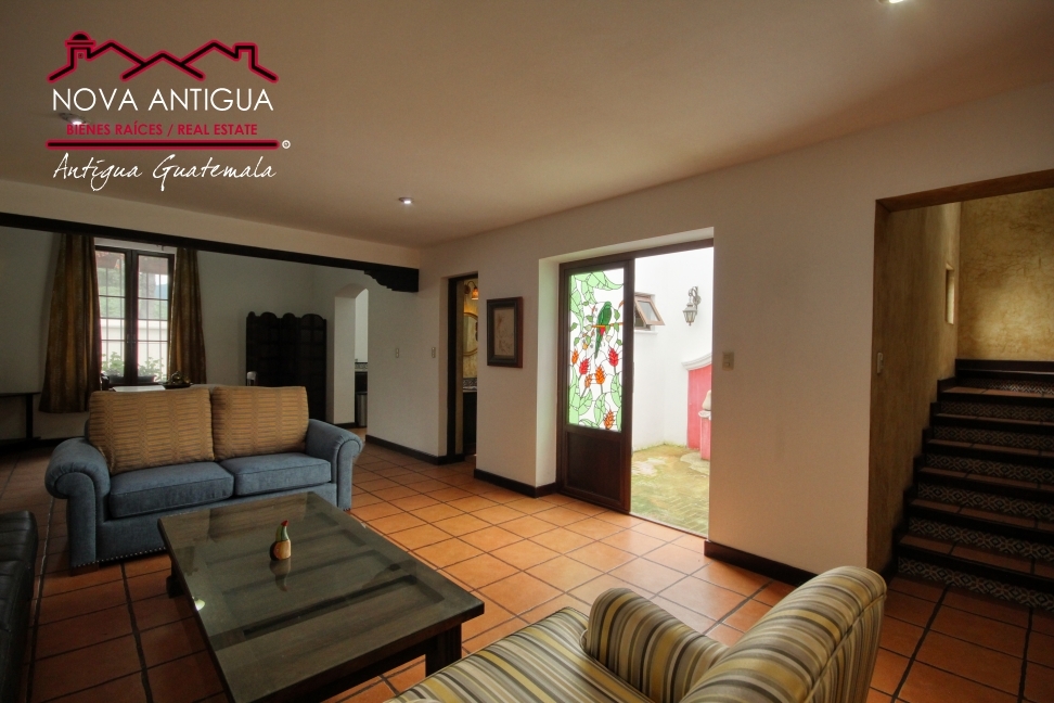 Casa en renta, ubicada a 7 cuadras del Parque Central de Antigua. Bodega, sala con chimenea, comedor, cocina con gabinetes y area de desayunador. 3 dormitorios, compartiendo un baño completo. Area de lavanderia con patio, dormitorio de servicio con bano, patio central con bucaro. Sin muebles.