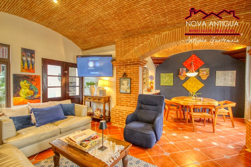 Al ingresar a la casa, te recibe una acogedora sala con una espectacular bóveda de ladrillo iluminada con luz indirecta, creando un ambiente cálido y sofisticado. Este espacio se conecta con el comedor a través de un elegante arco de ladrillo que resalta el carácter colonial de la vivienda.