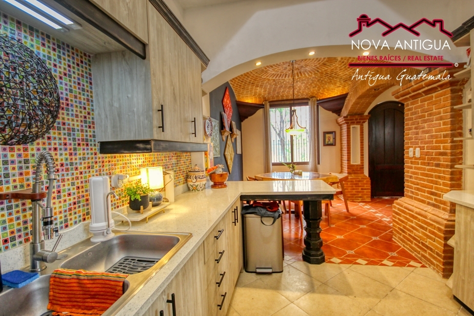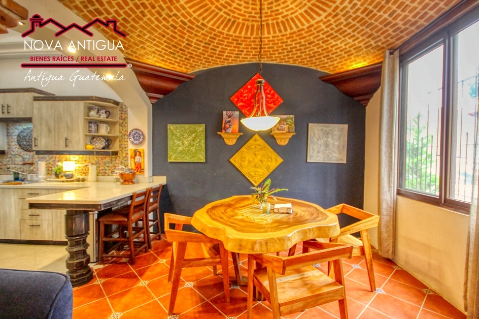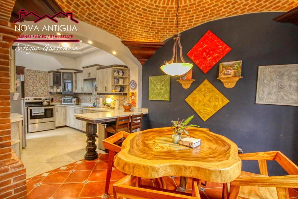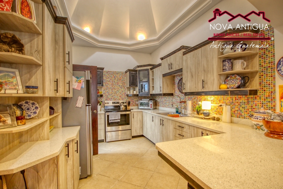 La cocina mantiene el estilo tradicional con gabinetes bajos y aéreos, coronada por su distintiva cúpula que aporta personalidad y amplitud al espacio.
